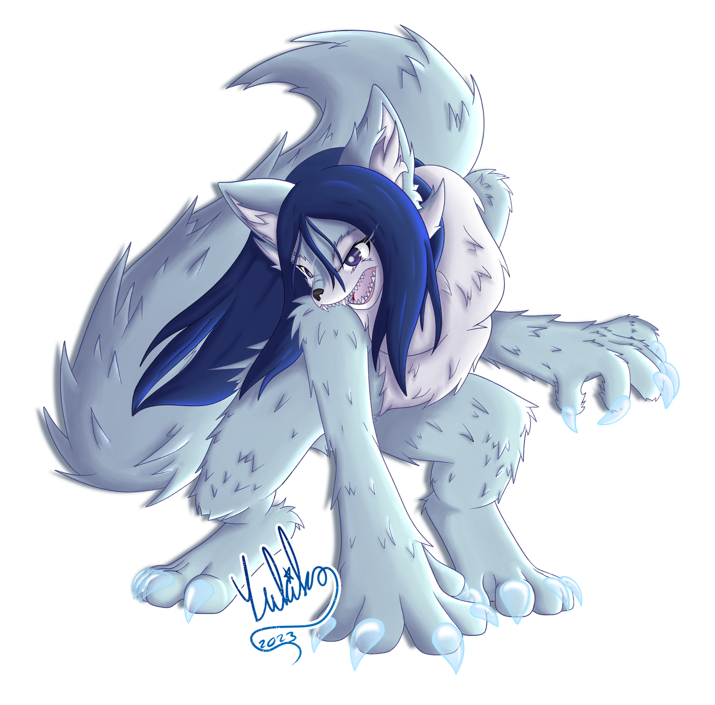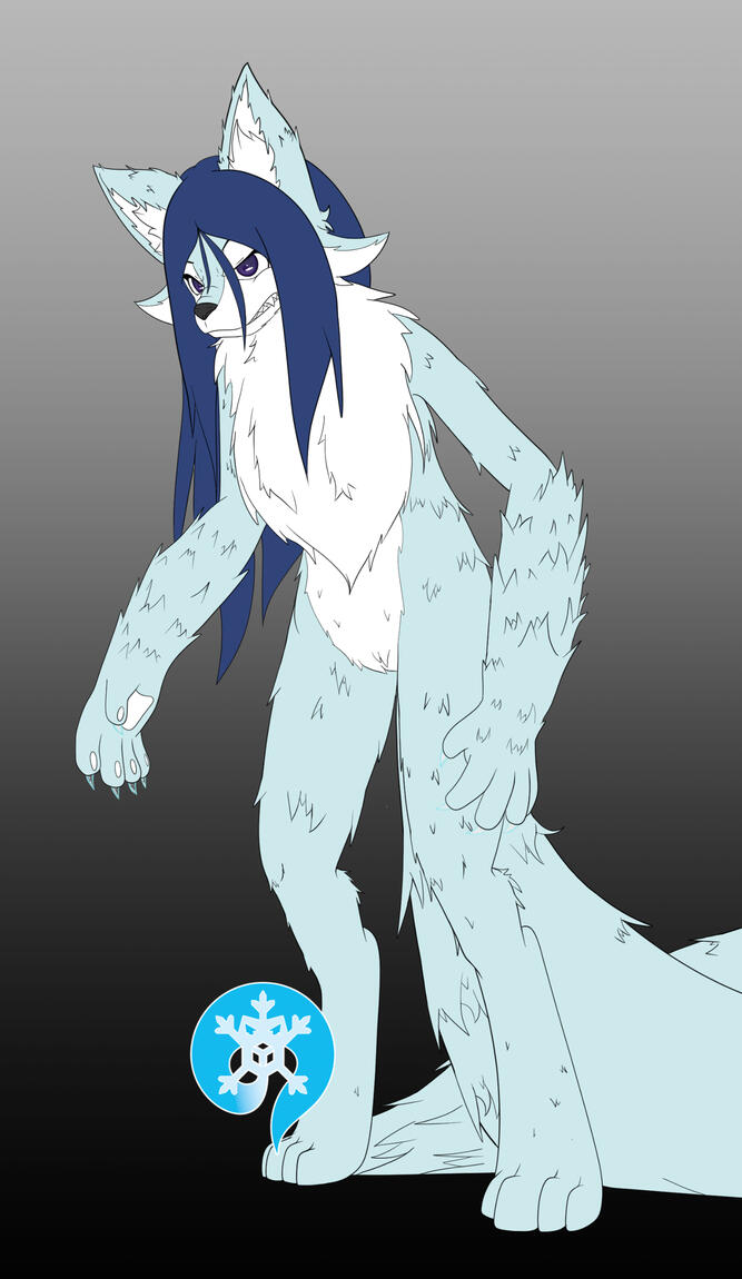 The characteristics of the beast form are generally those of an ordinary wolf, however, it varies in some aspects due to the modification of its DNA.The ice-colored pupil of her eyes turns ice-blue due to said modification. When it is daytime, the pupil shrinks, while when it is nighttime, the pupil enlarges resembling the light of a flashlight.The nails, although it seems that they are made of ice, they are not. They are completely normal nails whose appearance of keratin makes it look so striking.The body fur is hard and fine, while the fur on her neck is extremely soft, this serves in both cases to conserve body heat in cases of extreme cold.In particular, the fur on the back grows and stands on end, resembling stalactites that form in icy environments.The fur on her big tail becomes hard, rough, pointy and highly abrasive, perfect for attacking its prey.